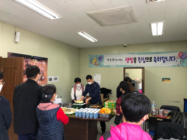 미리벌 3월 생일잔치 페이지 정보 작성자 최고관리자 작성일21-03-17 00:00 조회613회 댓글0건 이전글 다음글 목록 본문 -2021년 3월 생일잔치- 일 시: 2021년 3월 17일(수) 11:50~13:00장 소: 미리벌 제1 작업장참 가 인 원: 총 35명(이용장애인 29명/ 종사자 6명)식 사 메 뉴: 순대/떡복이/김밥/모듬튀김/식혜/과일/과자 등..생 일 자: 신숙향씨(3월16일) 댓글목록 등록된 댓글이 없습니다. 이전글 다음글 목록